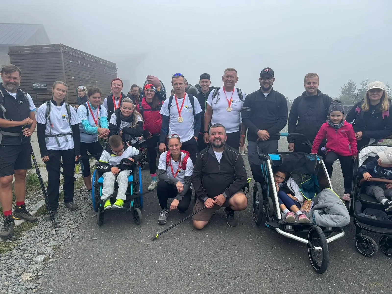 Alongside other teams, we set out on the climb, with the goal of collectively getting all wheelchair users to the summit of Lysá hora, thereby contributing to the experience of all participants—especially providing a beautiful and hopefully unforgettable experience for the wheelchair user, who can experience the power of team spirit and enjoy the extraordinary view offered by the highest peak of the Beskids.